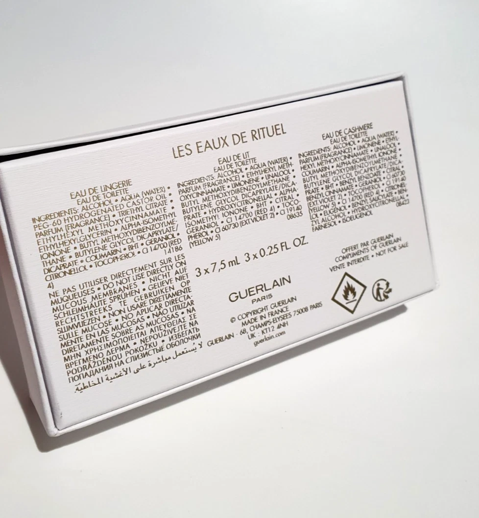 The Guerlain Les Eaux de Rituel Miniature Set is a rare collection of three 7.5ml splash bottles featuring Eau de Lingerie, Eau de Lit, and Eau de Cashmere. Originally designed for personal use or to be misted onto fine fabrics, these intimate scents are part of the Les Matières Confidentielles collection.